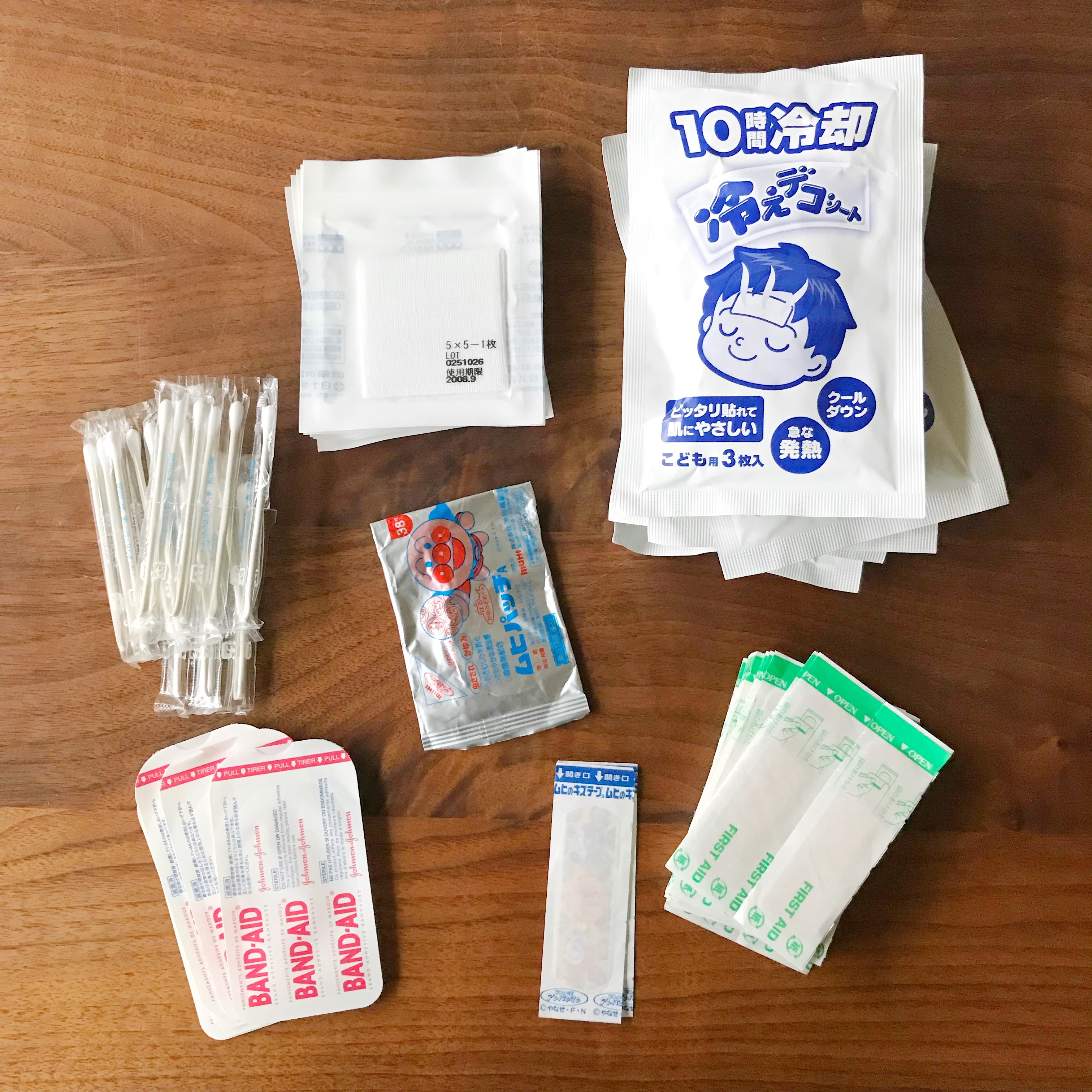 ガーゼ、冷えピタ、消毒液、