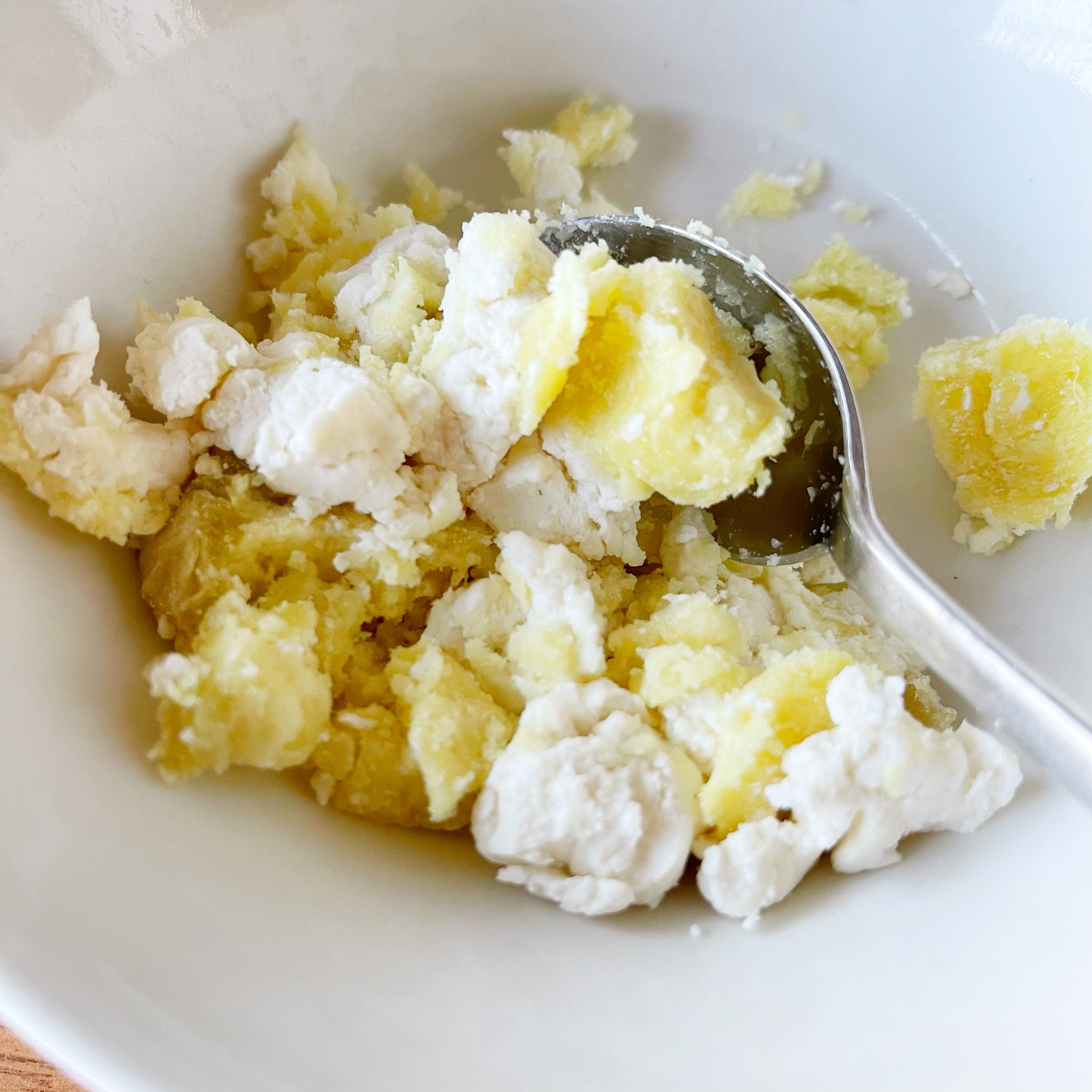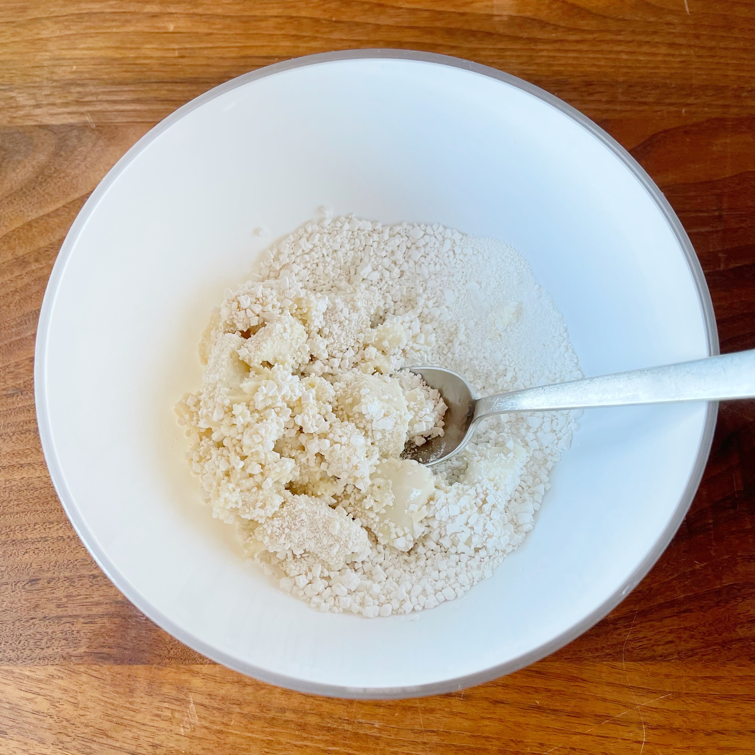 ボウルに白玉粉と豆腐を入れて混ぜます。